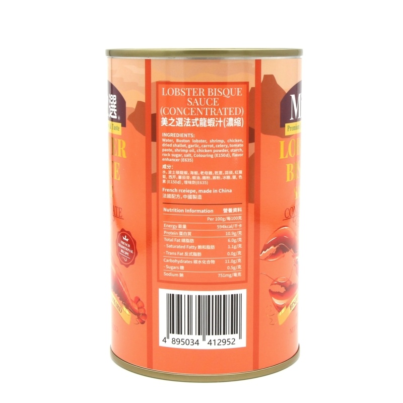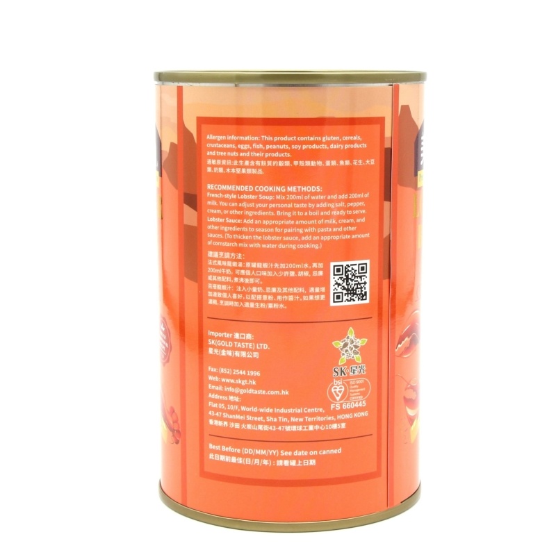 法式風味龍蝦湯: 原罐龍蝦汁先加200ml水,再加200ml牛奶, 可應個人口味加入少許鹽、胡椒, 忌廉或其他配料,煮沸後即可。